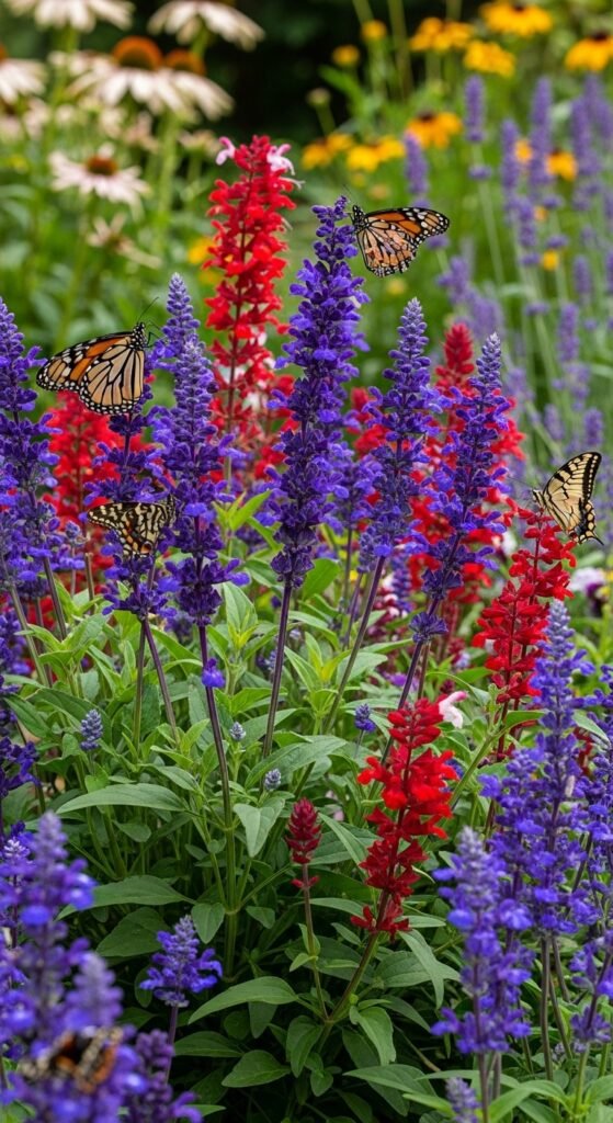 Salvia offers tubular flowers in reds, blues, and purples on upright stems, attracting butterflies with its nectar. Grow as perennials or annuals in full sun and well-drained soil, zones varying by species.