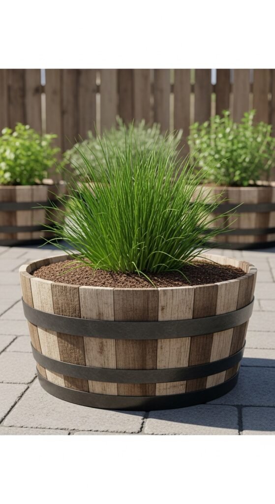 You use a halved whiskey barrel as a rustic container for abundant chive growth. Its size accommodates a large clump for heavy harvesting.