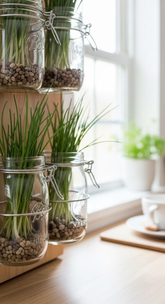 You craft a charming setup using mason jars mounted on a board for individual chive plants. This works great for kitchens or small patios.