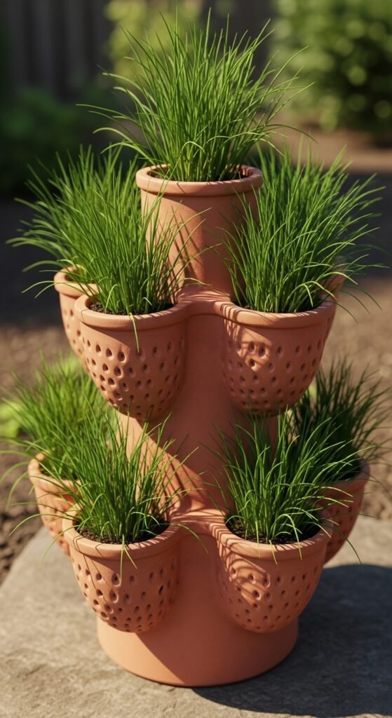 You repurpose a terracotta strawberry pot with multiple pockets for chive clusters. Each opening hosts a small bunch.