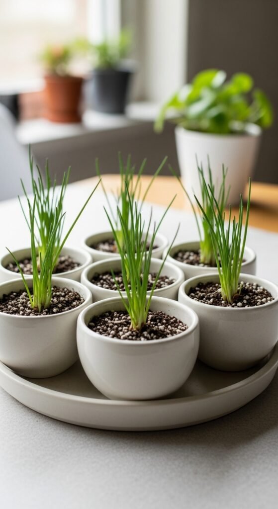 Method: Choose glazed bowls with holes, fill with gritty soil mix. Plant one chive per bowl. Cluster on a tray in bright spot. Water individually, rotate for even light. Harvest as needed. This approach allows experimenting with different varieties in one area.