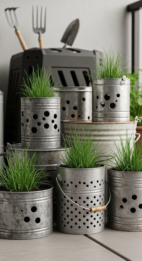 Steps: Clean containers thoroughly, drill holes if needed. Fill with herb-specific soil, plant chive seeds or bulbs. Place in sunny spots, grouping for visual impact. Water consistently, checking more often in metal containers that heat up. Harvest by cutting at base. For more on sustainable practices, explore our tips on herb gardening for beginners.