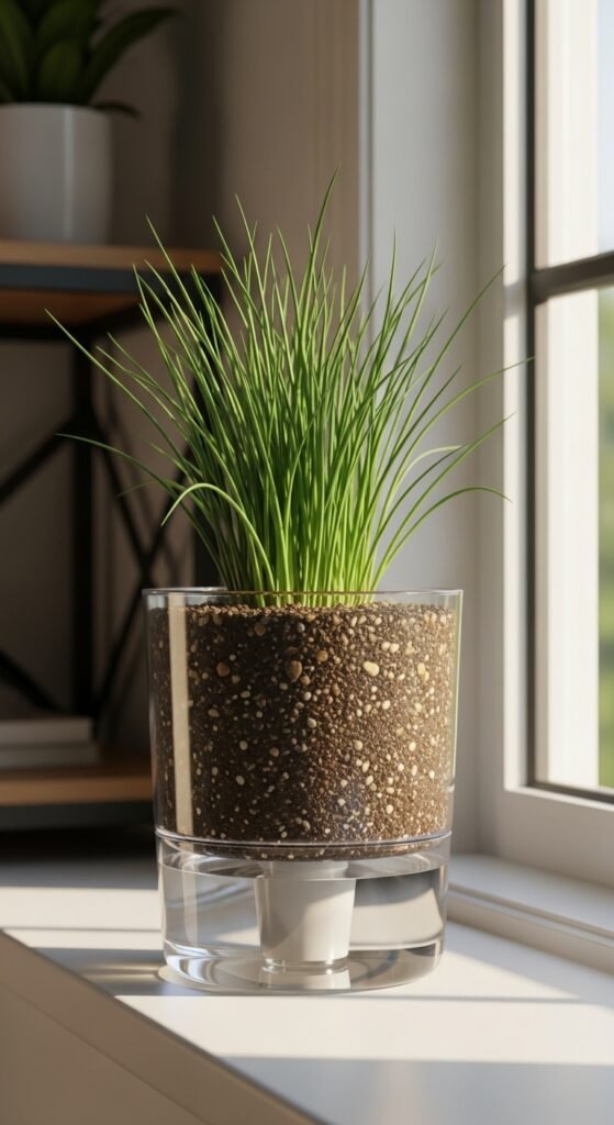 You invest in or DIY a self-watering container to maintain consistent moisture for your chives. These have reservoirs that wick water up as needed.