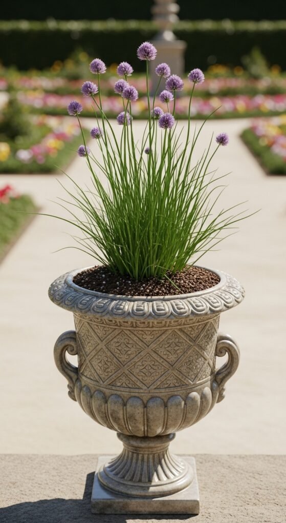 You elevate your chives in an ornate urn for a sophisticated touch on patios or entryways. Select a 12-16 inch wide urn with drainage.