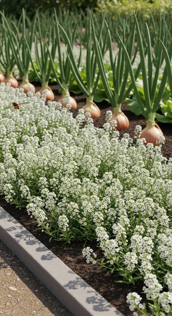 Sweet alyssum underplants lettuce, radishes, and onions, attracting hoverflies to eat aphids while suppressing weeds. Its tiny white flowers scent the air. Prime perks are weed control and pest predation.