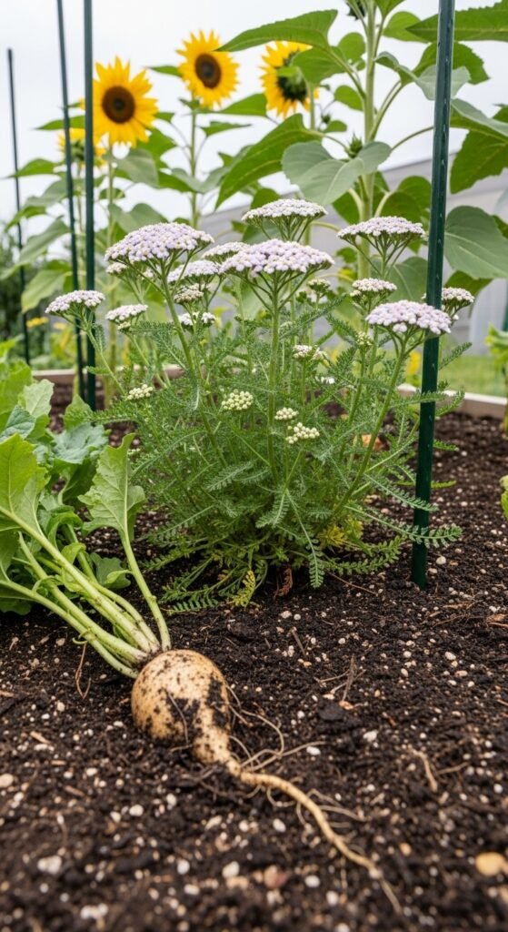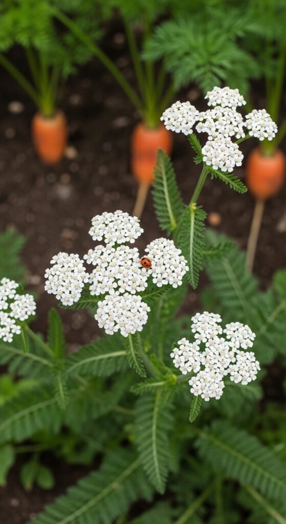 Yarrow benefits root veggies like carrots and beets by accumulating nutrients and attracting ladybugs. Its ferny leaves and flat flower clusters endure drought. Key upsides are soil fertility boost and insect balance.
