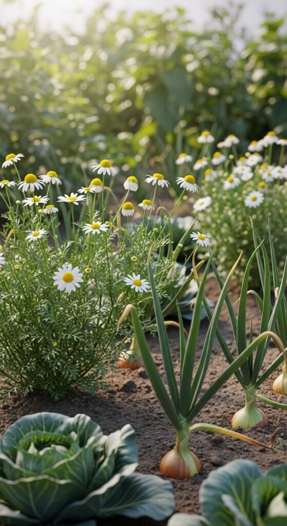 Chamomile aids onions and cabbage, improving flavor and repelling flies. Its apple-scented daisies calm the garden. Significant gains are flavor enhancement and gentle pest control.