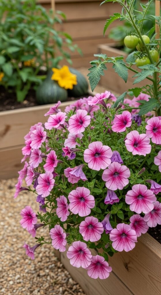 Petunias protect tomatoes and squash from aphids and hornworms with their trumpet blooms. Essential perks are aphid control and continuous color.