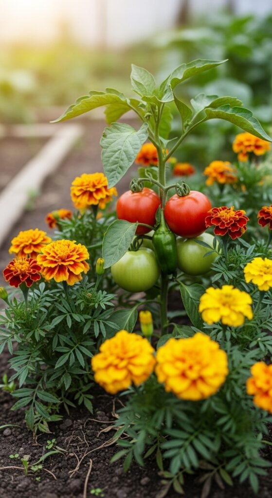 You can plant marigolds alongside tomatoes, peppers, and potatoes to naturally ward off nematodes and other soil-borne pests. These bright orange and yellow flowers release compounds from their roots that repel harmful insects, creating a protective barrier for your vegetables. The key benefit is reduced pest damage without pesticides, leading to healthier plants and higher yields.