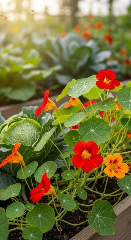 Nasturtiums are excellent companions for cabbage, broccoli, and squash, acting as a sacrificial plant that draws aphids and cabbage worms away from your veggies. Their peppery flowers and leaves are edible, providing a dual purpose in your garden. This trap crop strategy minimizes damage to your main harvest, allowing vegetables to grow undisturbed.