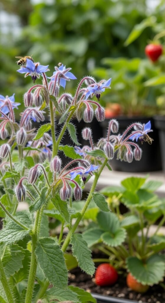 Pair borage with strawberries, tomatoes, and squash to draw in bees and other pollinators with its star-shaped blue flowers. This herb-like flower increases pollination rates, leading to better fruit development and larger harvests. The primary advantage is enhanced yield through natural pollination, making your vegetables more productive.