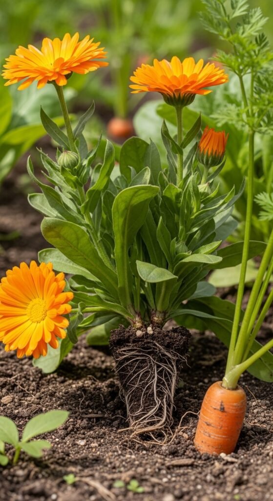 Calendula, or pot marigold, complements carrots, beans, and lettuce by repelling aphids and improving soil structure with its deep roots. Its daisy-like orange flowers are medicinal and edible, offering extra utility. Key perks include pest repulsion and soil aeration, fostering robust vegetable growth.