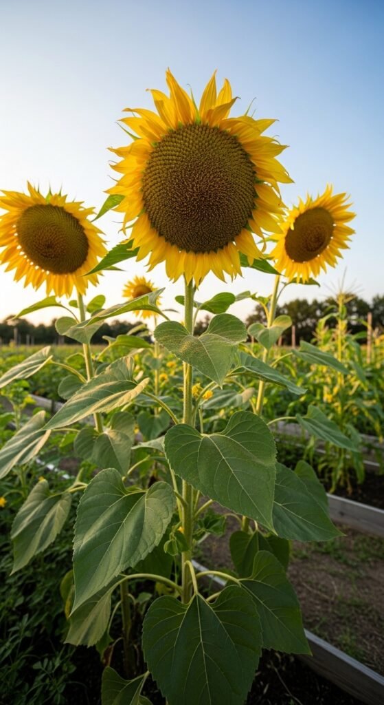 Sunflowers work wonders with corn, cucumbers, and pole beans, providing shade and acting as trellises for climbing veggies. Their large heads attract birds that eat pests, and pollinators flock to the blooms. Major benefits are structural support and biodiversity boost, enhancing garden efficiency.
