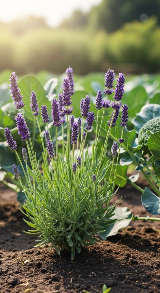 Lavender pairs beautifully with brassicas like broccoli and cauliflower, deterring moths and fleas with its fragrant purple spikes. It also attracts bees for pollination. Essential advantages include pest deterrence and aromatic appeal, creating a serene, productive space.