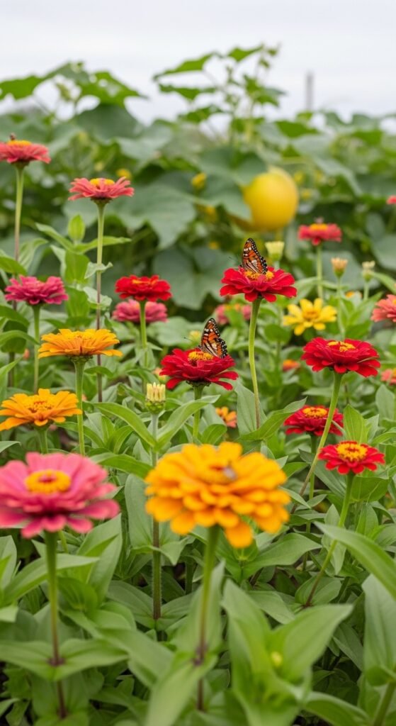 Zinnias enhance pumpkins, melons, and beans by attracting butterflies and bees for superior pollination. Their colorful, daisy-like flowers come in various heights. Top benefits are increased pollination and vibrant aesthetics, leading to bountiful fruits.