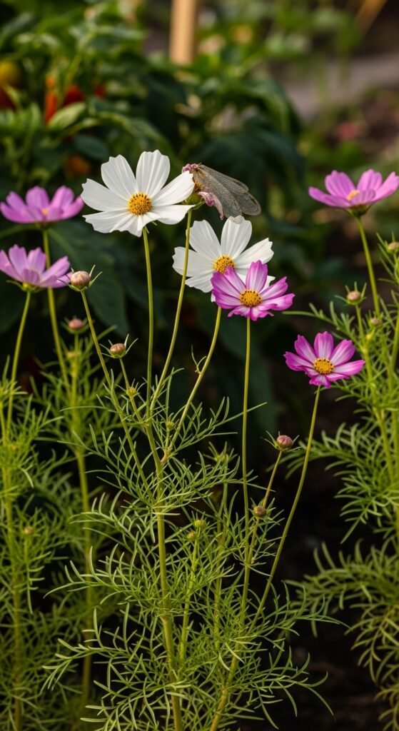 Cosmos companions well with tomatoes and peppers, luring lacewings and parasitic wasps that prey on pests. Their feathery foliage and daisy blooms add height. Core gains are natural pest management and extended bloom time.