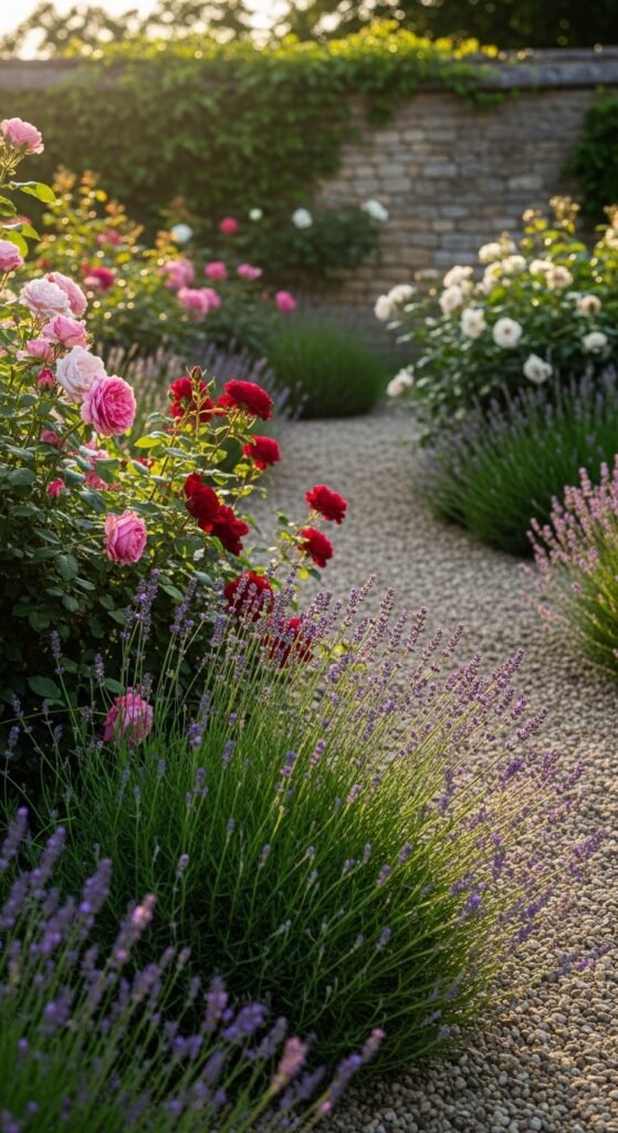 You’ll find lavender ideal with roses, repelling aphids and enhancing fragrance. Lavender’s drought tolerance matches roses.