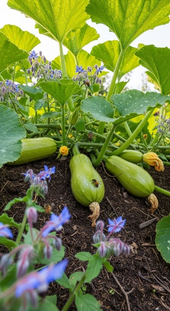 Self-seeding borage sustains. Enjoy abundant squash. Explore companion planting herbs for more.