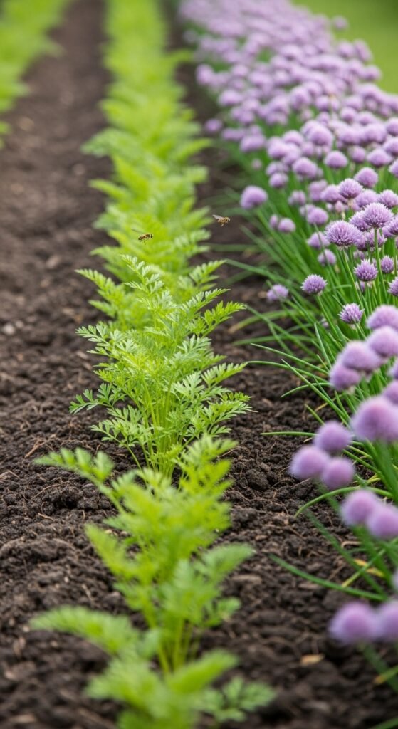 The mechanism behind this is chives’ sulfur compounds, which act as a natural repellent. They also attract hoverflies that consume soft-bodied insects. Sow chive seeds around carrot beds in full sun with loose soil, ensuring 6-8 inches between plants for proper growth.
