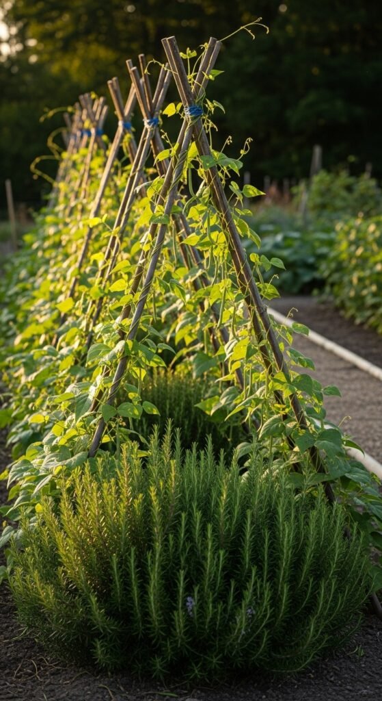You can plant rosemary alongside beans to deter bean beetles and improve air circulation, reducing fungal diseases. Rosemary’s woody structure provides a natural barrier, supporting bean vines while its aroma confuses pests.