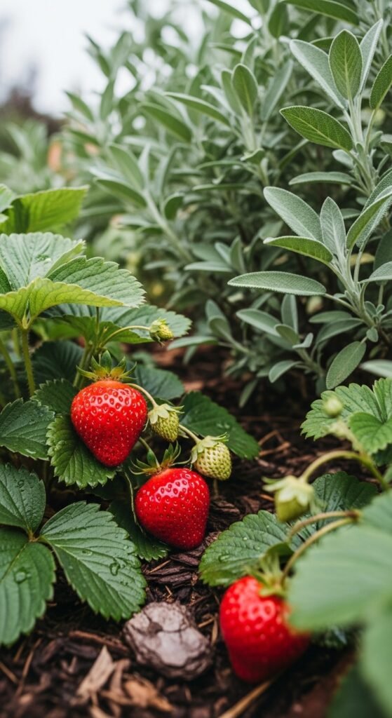 Why choose this? Sage’s dense foliage shades strawberry roots, conserving moisture and suppressing weeds. Position sage plants around strawberry patches in well-drained soil under full sun, with 12-18 inch spacing.