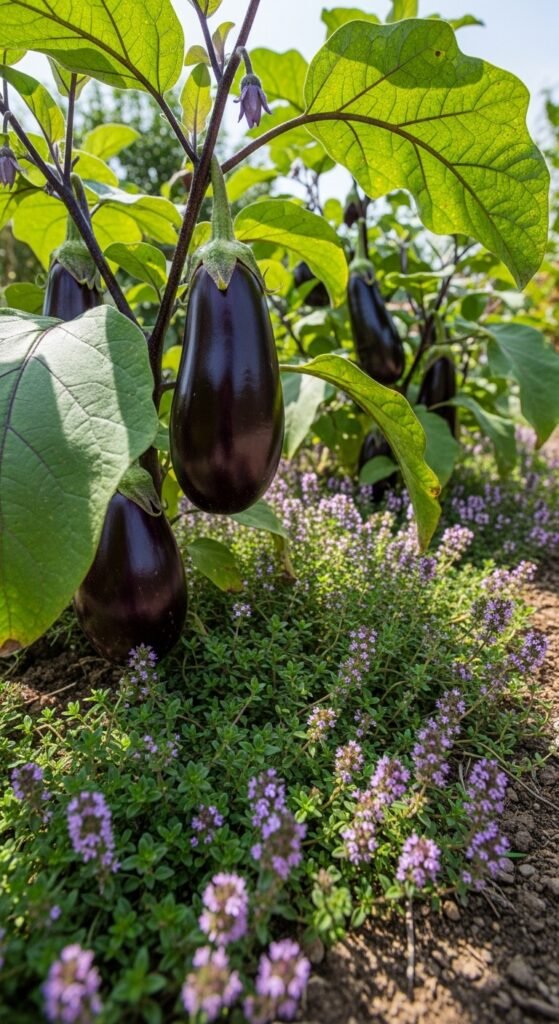 You can use thyme as a companion for eggplants to repel flea beetles and spider mites. Thyme’s creeping habit covers soil, reducing weed growth and retaining moisture for eggplants.