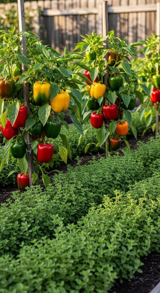 You’ll benefit from planting oregano near peppers, as it deters aphids and attracts beneficial insects. Oregano’s spreading nature provides ground cover, minimizing soil erosion.