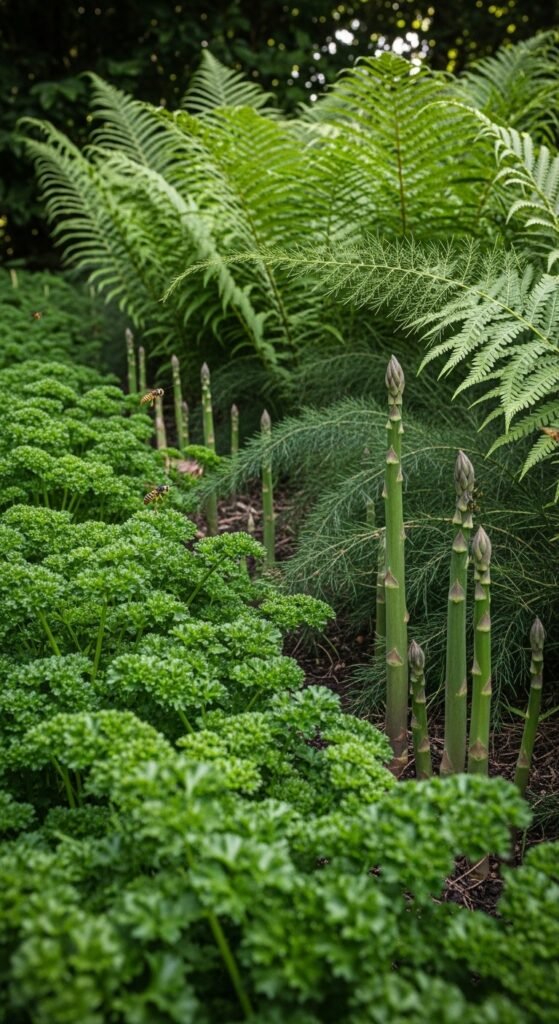 Why effective? Parsley improves soil structure and attracts pollinators for asparagus. Plant parsley borders around asparagus beds in partial shade with rich soil, 8 inches apart.
