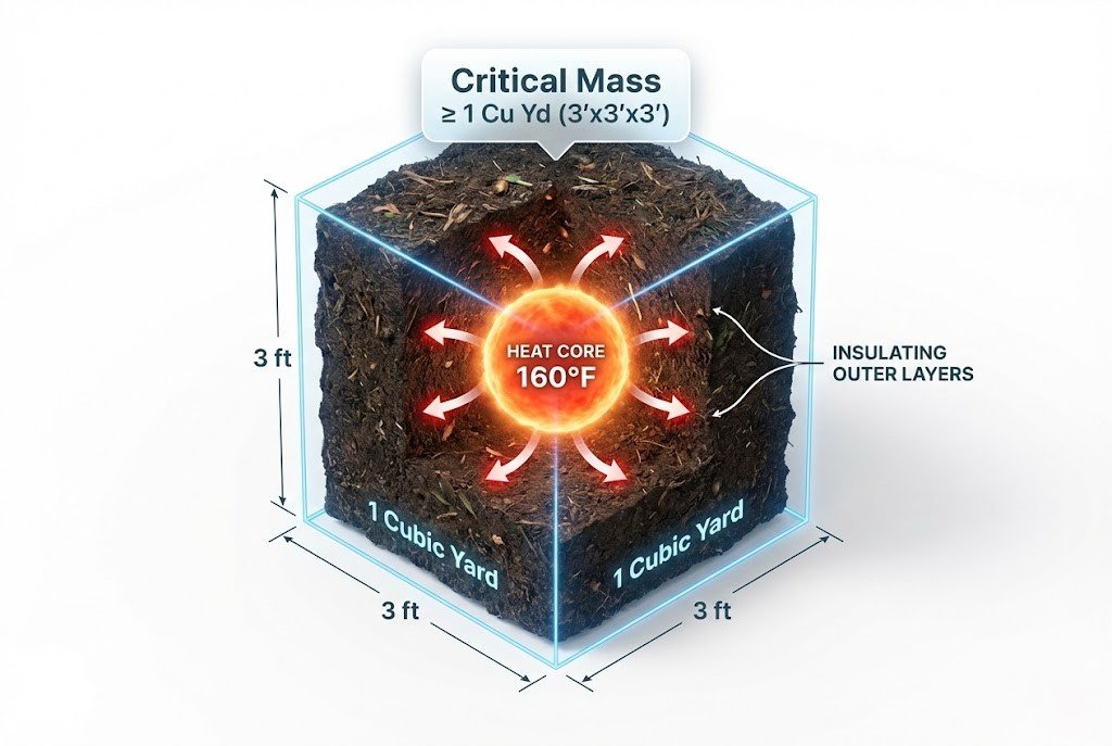 The difference between a pile of rotting garbage and “Black Gold” often comes down to one thing: Mass. Composting is a biological process driven by billions of bacteria. Like a crowded room, these bacteria generate heat as they work. If your pile is too small, the heat escapes before it can build up, resulting in a slow “cold pile” that takes a year to break down. If the pile is large enough, it self-insulates, creating a “hot pile” that can finish in weeks.