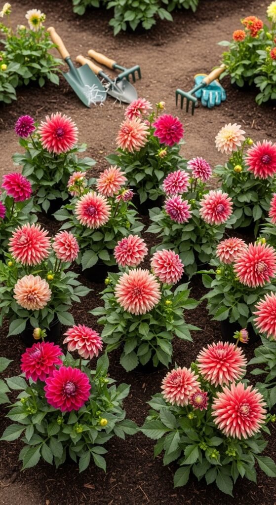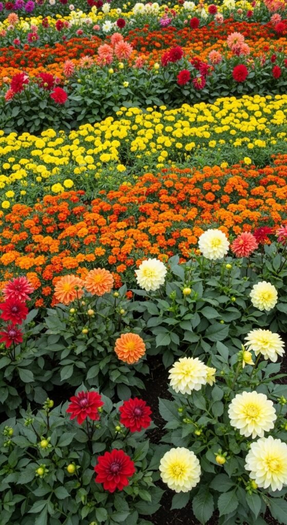 Pair dahlias with companions like marigolds for pest control. Plant interspersed in beds.