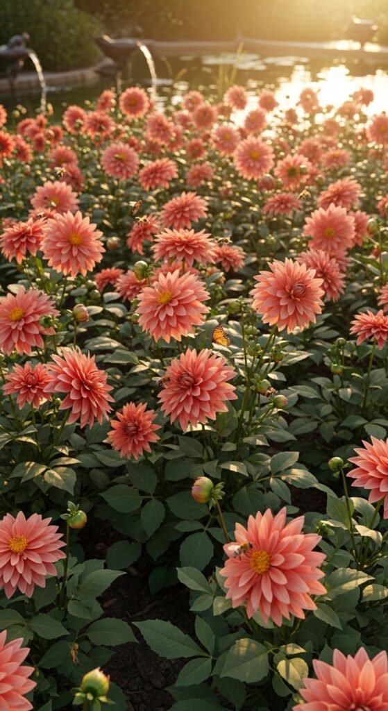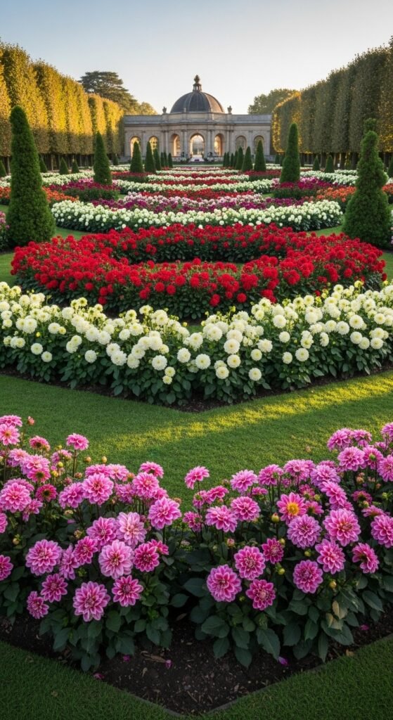 Incorporate dahlias into formal layouts for structured beauty. Use symmetrical plantings with uniform varieties.