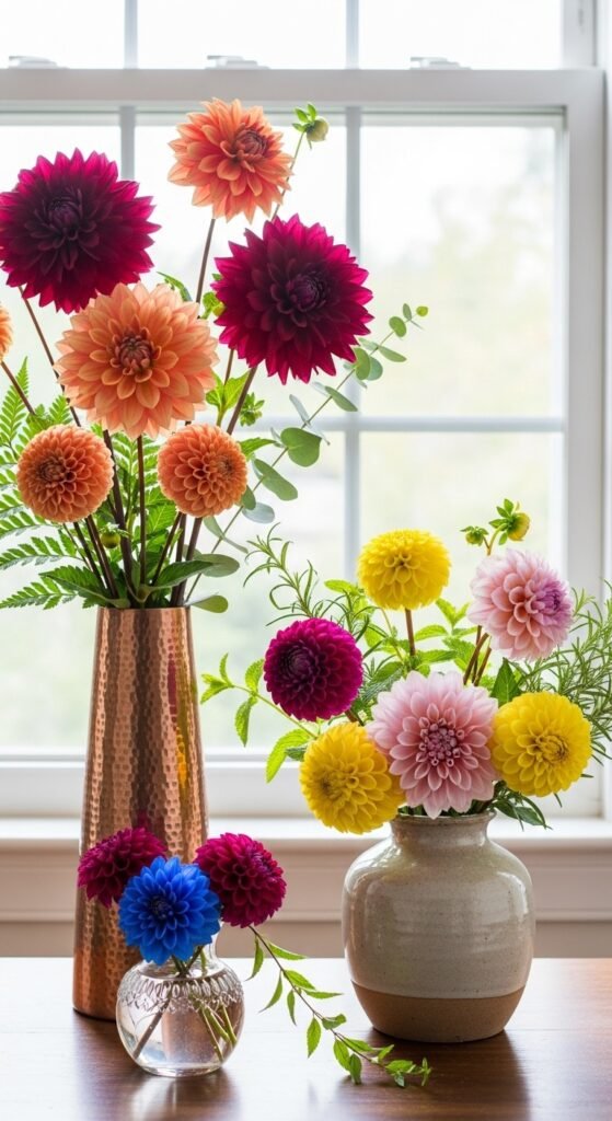 Arrange harvested dahlias in creative vases for indoor joy. Mix sizes and colors, adding greenery.