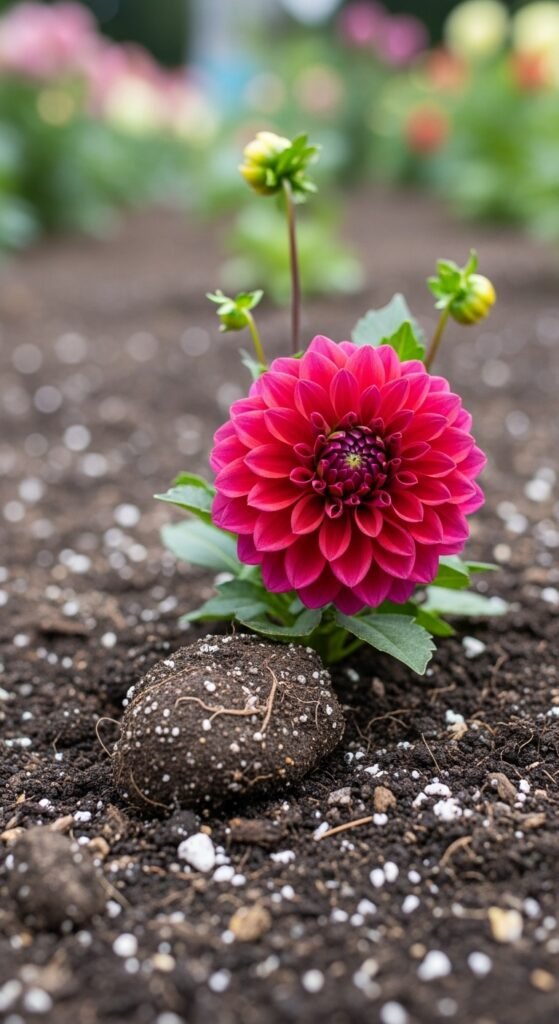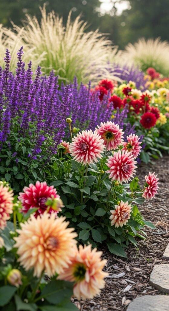 Integrate dahlias into mixed borders for layered color and texture. Combine with perennials like salvia or grasses, planting tubers among established plants. Amend soil with compost for nutrition, ensuring 6-8 hours of sun.