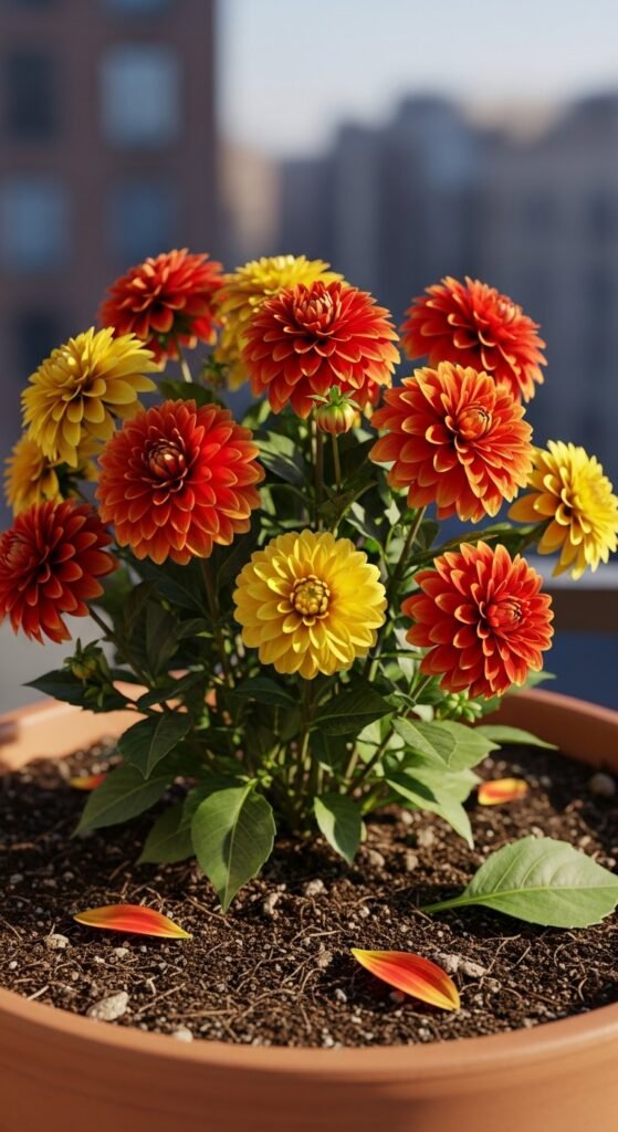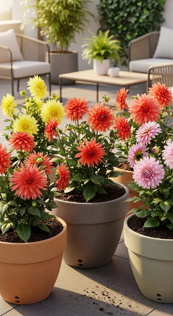 Grow dahlias in containers for flexible patio displays. Choose large pots with drainage, filling with potting mix and planting one tuber per pot. Opt for compact varieties to fit small spaces.