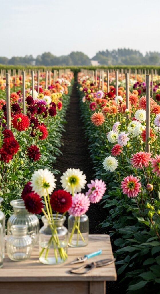 Design a cutting garden focused on dahlias for endless bouquets. Plant in rows for access, using tall stakes for support. Select long-stemmed varieties for arrangements.