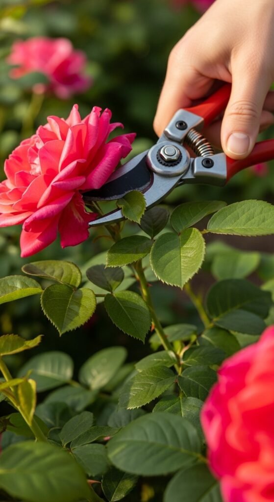 Reason: Prevents self-seeding overload and maintains vigor. Drought-resistant boost. Link to general pruning roses in spring for similar techniques.