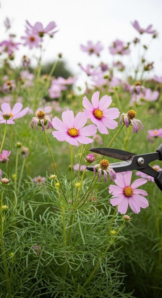 How: Use shears to trim back clusters of faded blooms to a bud. Check weekly, especially after rain. This simple step will keep your cosmos dancing in the breeze with endless grace.