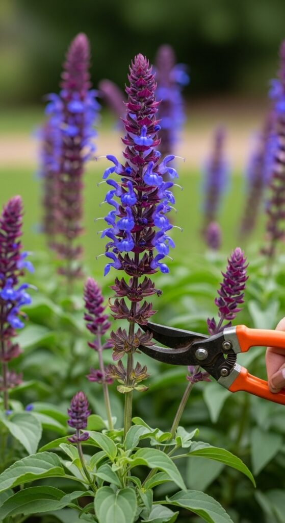 Salvia’s spiky blooms in blues and reds attract pollinators like hummingbirds. Deadheading extends their nectar-rich spikes, supporting wildlife. This boosts biodiversity and prolongs color, creating a dynamic garden ecosystem.