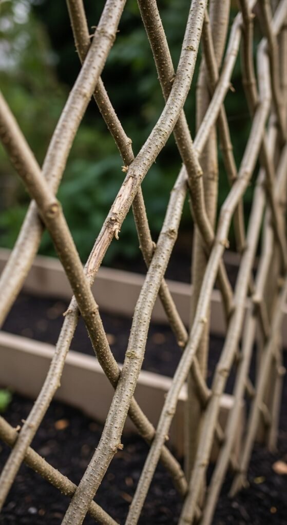 You weave flexible branches into a lattice panel for the raised bed, offering a natural, artisanal look. Source branches from prunings for zero cost.