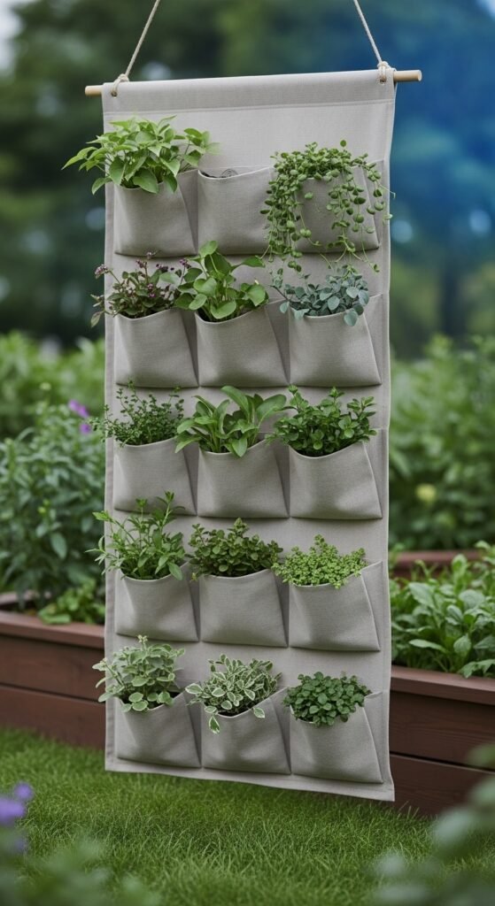 You create a hanging pocket trellis by suspending fabric pockets from a frame over the raised bed, ideal for trailing plants. This adds vertical layers.