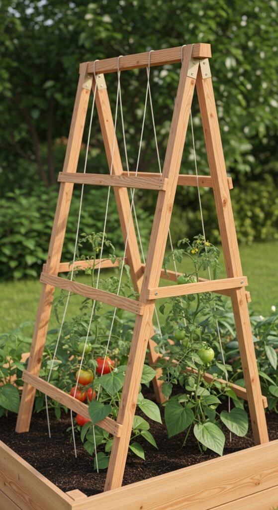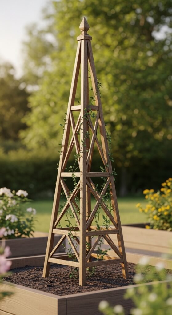 You enjoy ornamental appeal and concentrated growth, ideal for focal plants. Build by cutting four legs, attaching cross slats progressively narrower toward the top, and capping with a finial. Position securely in the bed.