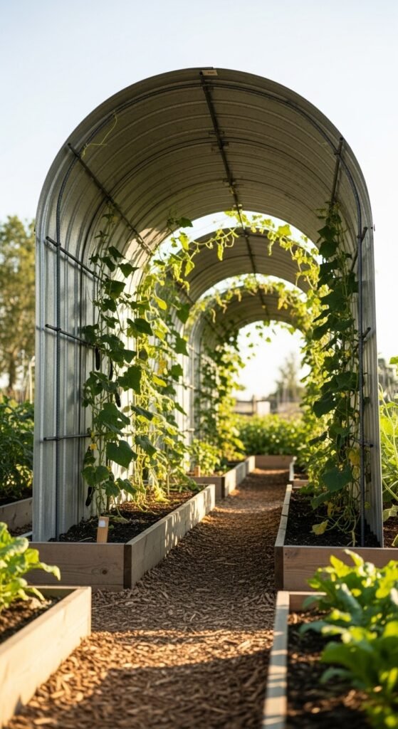 A cattle panel arch involves bending a sturdy metal livestock panel into an arch shape over your raised bed, creating a tunnel-like structure for climbing plants. This durable option withstands weather and supports substantial weight from mature vines.