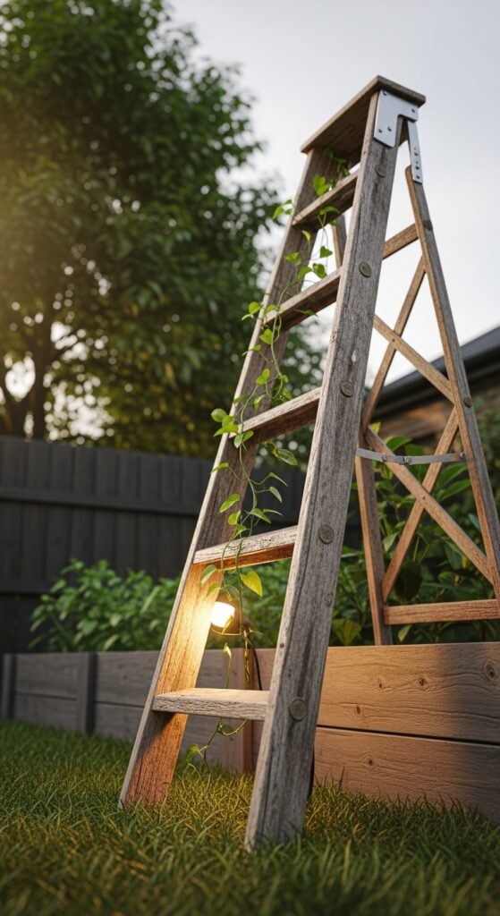 You transform an old wooden ladder into a trellis by leaning it against the raised bed or securing it vertically, using the rungs as support levels for climbing plants. This upcycled approach adds rustic charm.