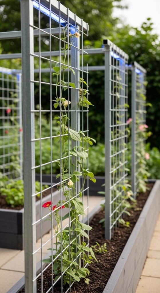 You install wire mesh panels vertically along the raised bed’s side, creating a flat trellis for plants to climb. This industrial material provides strong, open support.