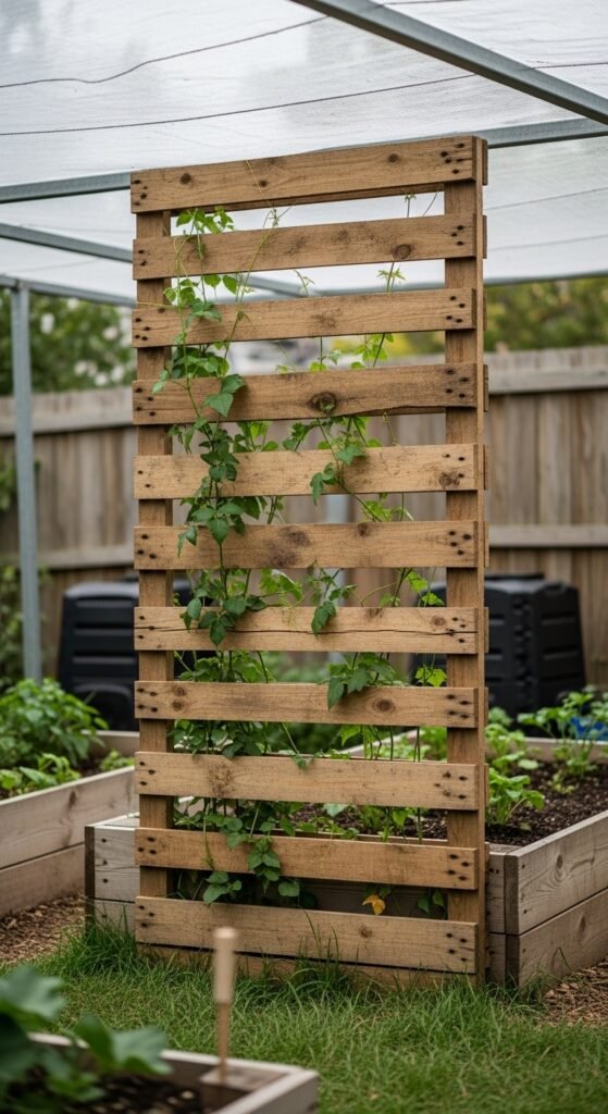 You repurpose a wooden pallet by standing it upright against the raised bed, using the slats as climbing aids. This budget-friendly option promotes sustainability.