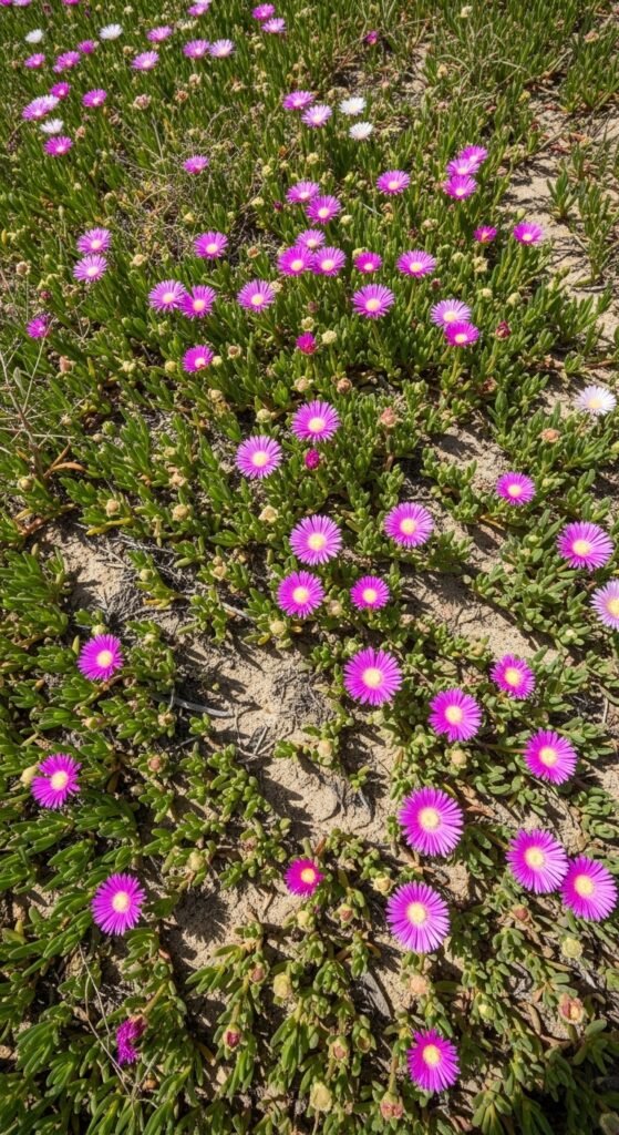 Ice plant forms mats of succulent foliage with daisy-like flowers in bright hues, ideal for ground cover in arid areas.