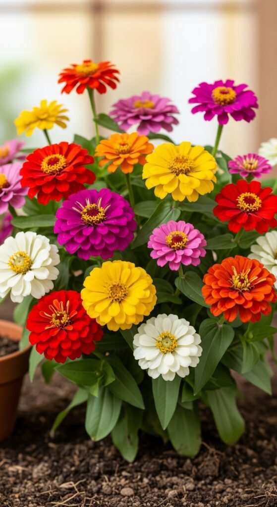 Zinnia boasts bold, daisy-shaped flowers in every color, easy to grow from seed in dry conditions.