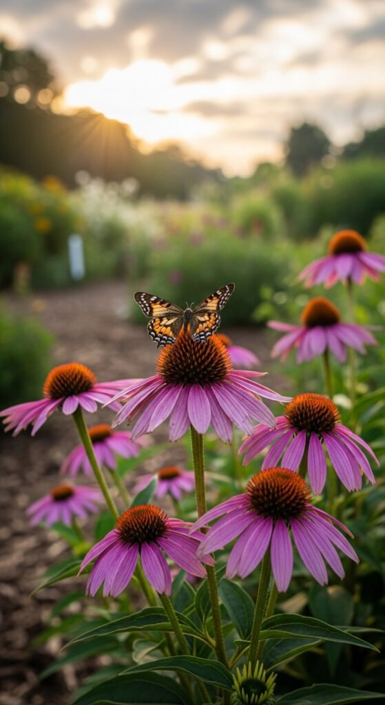 Plant coneflowers in well-drained soil with full sun exposure. Space them 18-24 inches apart and deadhead spent blooms to prolong flowering. If expanding to herbs, explore drought tolerant herbs for companion planting. Enjoy the show from midsummer onward, with some varieties offering winter interest through seed heads.