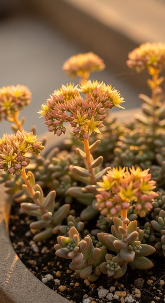 Propagate by cuttings or divisions in spring, planting in gritty soil for drainage. Water sparingly, following a succulent watering schedule. Sedum blooms late summer to fall, adding late-season interest and attracting pollinators.