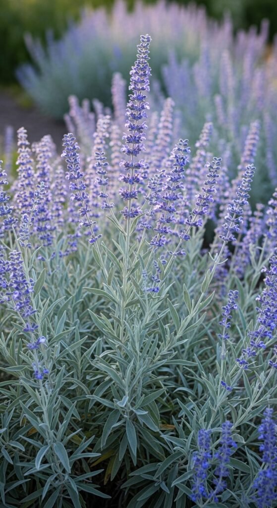 Russian sage delivers tall spires of lavender-blue flowers atop silvery foliage, creating a hazy, ethereal effect in your garden. This perennial shrub thrives in arid environments, mimicking steppe conditions.